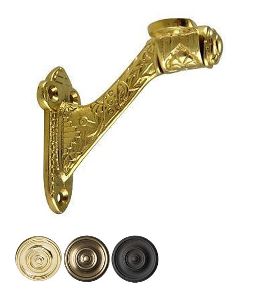 Measures 3 1/2 inches tall and 1 3/8 inches wide with a projection of 3 3/8 inches. Comes complete with mounting hardware. Available in several finishes, including polished brass, antique brass and Black Bronze. The average lead time for this rail bracket is approximately 2 to 4 business days.