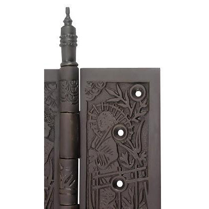 Measure 4 1/2 inches by 4 1/2 inches. Marked on back of each No. 17, Pat Jan 13 1880 with the size. Ornate styling on both sides. The finials and pins are removeable. Made with the lost-wax casting process, sometimes known by the French name of cire perdue is an ancient practice that is still used for artwork today and it is used to preserve the fine details of the original door components. Available in polished brass, antique brass, and Black Bronze. This component is made from solid unlaquered brass which will patina naturally over time. These hinges are sold in pairs. This particular product has an average lead time of approximately 2 to 4 business days.