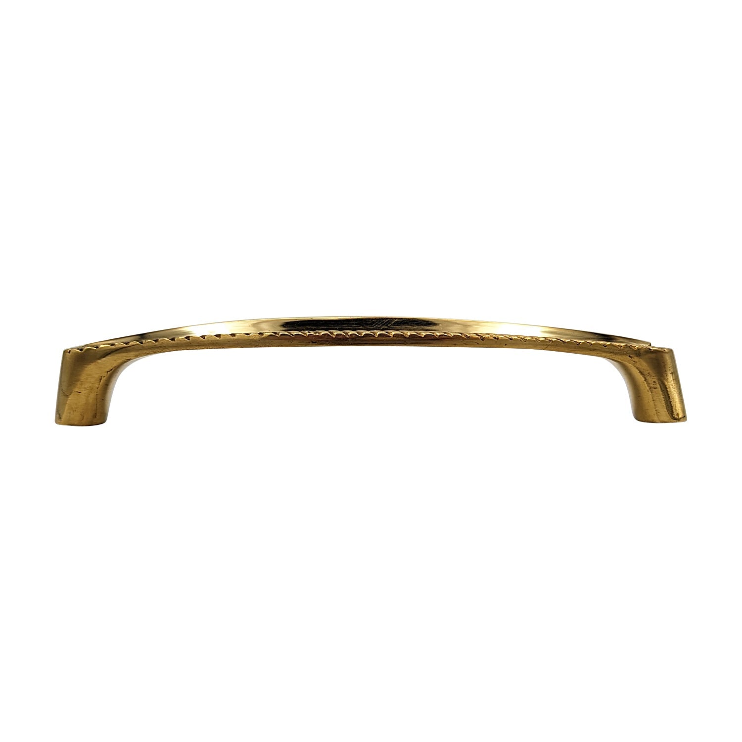 This pull measures 5 1/2 inch long and 5 inch center to center mounting distance (5.00 c-c) with a projection of 2/3 inch. Coordinating knob available. Comes complete with the mounting hardware. Comes in a variety of finishes including Polished Brass, Antique Brass, and Black Bronze.
