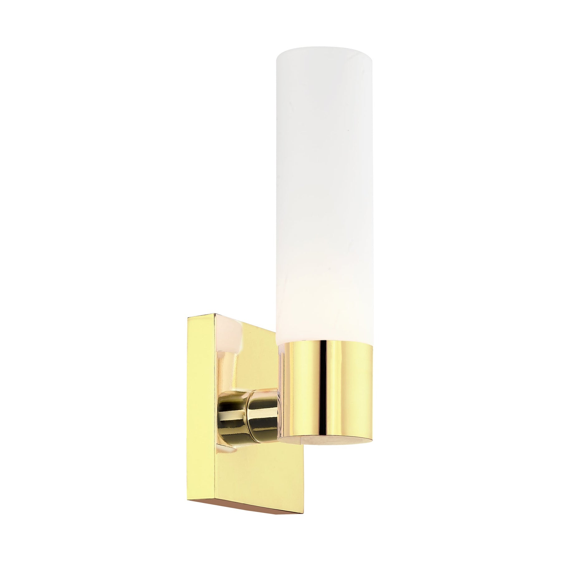 The Aero ADA Wall Sconce in Polished Brass offers a sleek and contemporary lighting choice for any space. It features a unique hand-blown satin opal white twist lock glass that beautifully diffuses light from a single candelabra base bulb (not included), with a maximum wattage of 60W. Measuring 4.5 inches in width and 11.25 inches in height, the sconce extends 4 inches from the wall, making it ideal for various settings. Additionally, it is suitable for damp locations, providing versatility for bathrooms and other humid environments.