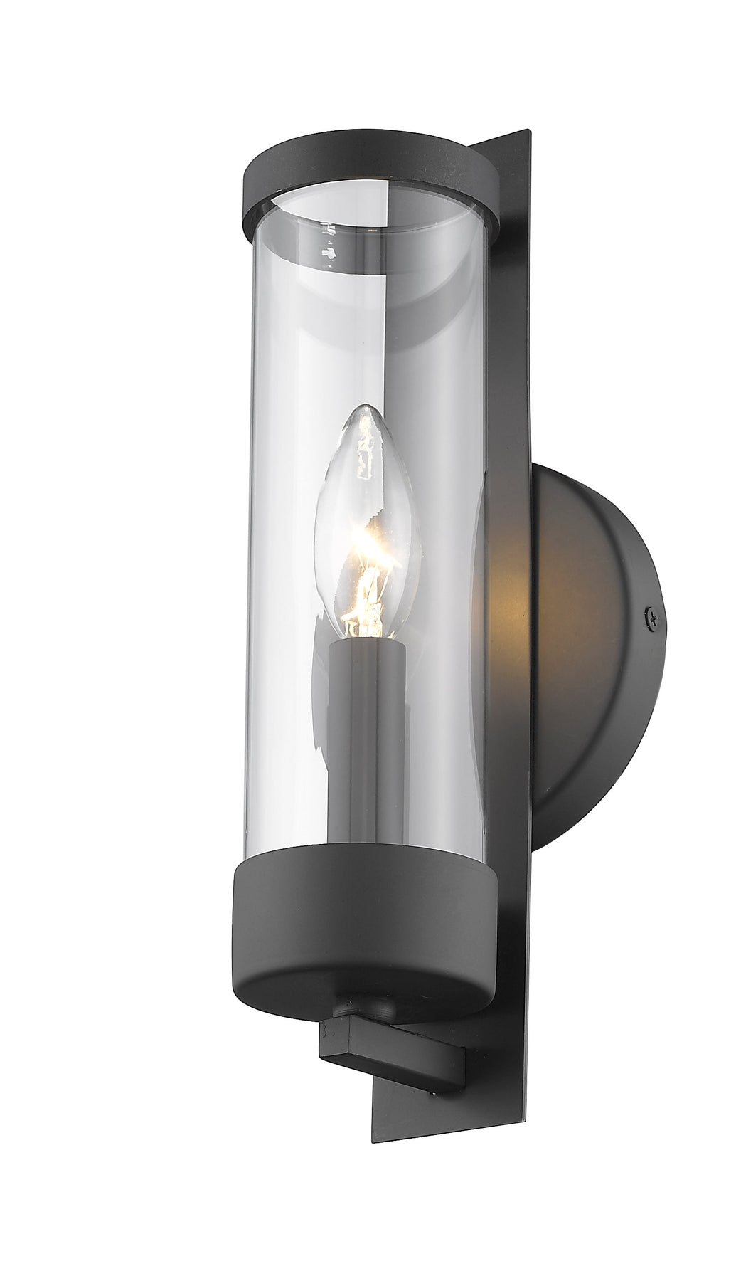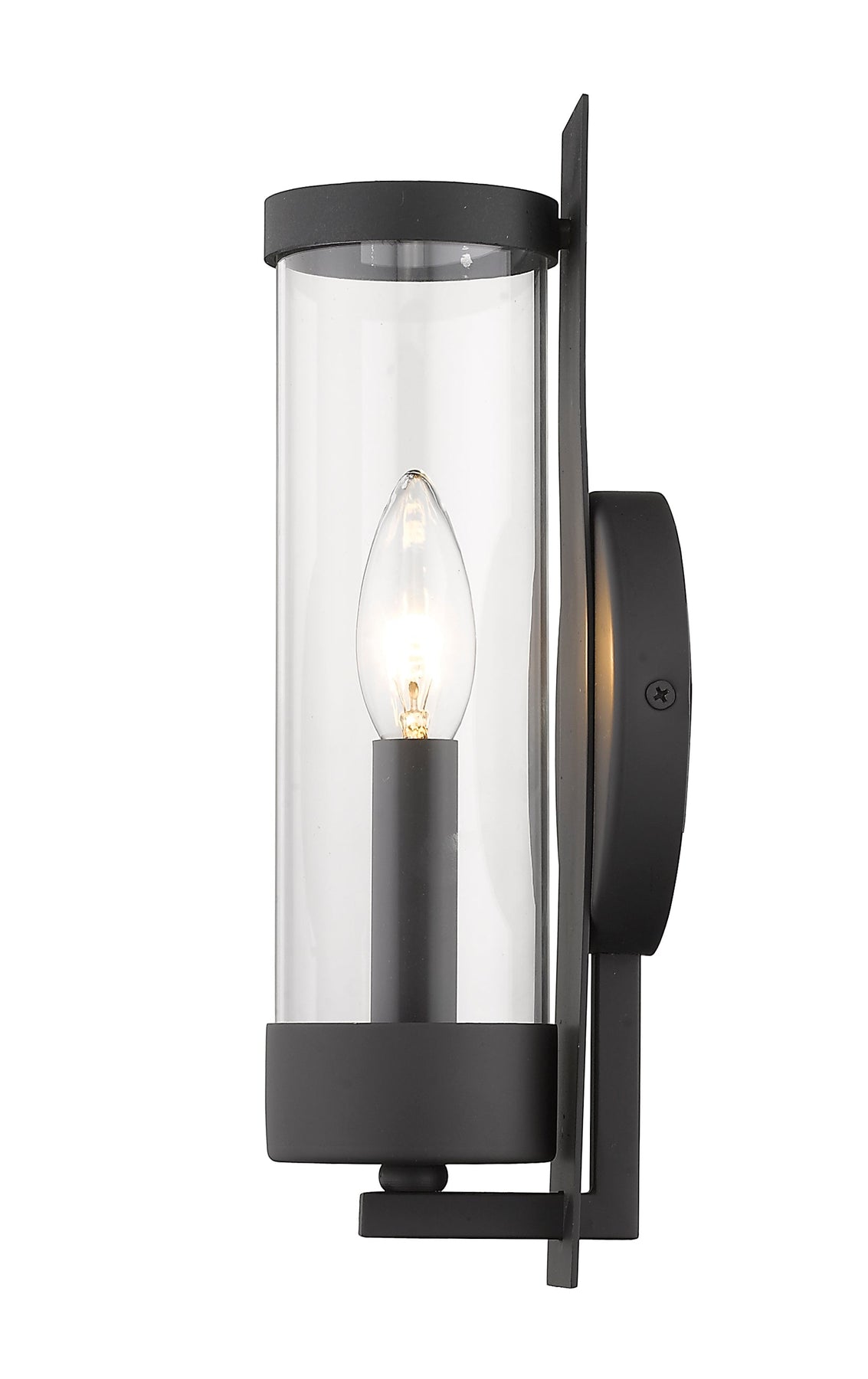 The Castleton Wall Sconce in Bronze is a sophisticated addition to any modern interior. This stylish fixture features a clear glass cylinder framed by sleek bronze steel straps, providing a clean and contemporary look. It requires one candelabra base bulb (not included) with a maximum wattage of 60W. Measuring 4.75 inches in width and 12 inches in height, with a 4-inch extension, this sconce is designed for damp locations, making it a versatile choice for various settings while maintaining your minimalist aesthetic.