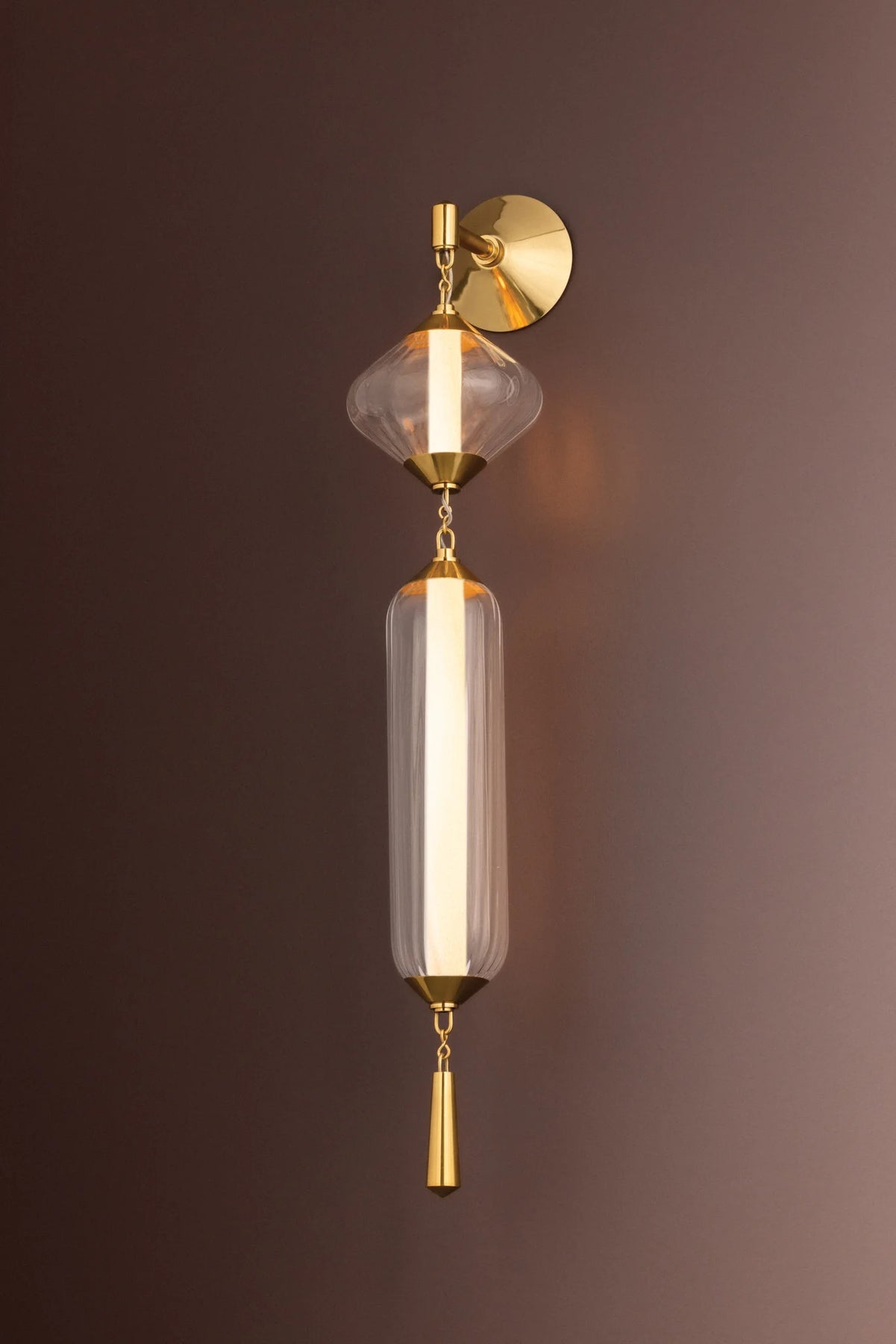 Fiorello’s gracious proportions magnify its impact. Combining geometric shapes, clear ribbed glass, and stylish metal counterweights, this installation-style piece is like jewelry for the home. The Vintage Patina Brass finish on the metalwork enriches the retro shapes, while the LED tubes feel fresh and contemporary. Fiorello is available as a 2-light sconce, a 3-light pendant, and a grand 9-light chandelier that stretches almost from floor to ceiling.